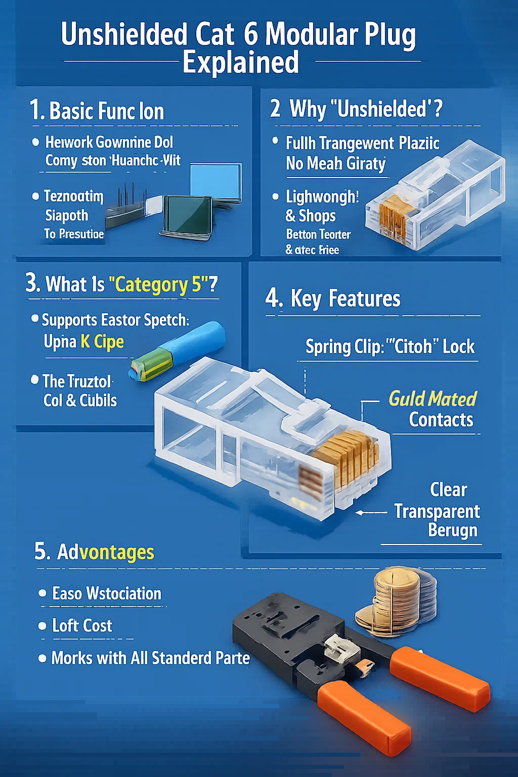 Metallkontakte: Ganz vorne am Stecker befinden sich acht kleine, goldgelbe Kupferkontakte. Beim Crimpen mit einer Zange durchbohren diese kleinen Kupferkontakte die Aderisolierung und halten den Kupferkern im Inneren fest. Transparentes Material: Warum transparent? So können Sie bei der Herstellung von Netzwerkkabeln leicht erkennen, ob die acht farbigen Drähte im Inneren in der richtigen Reihenfolge sind, was den Vorgang sehr intuitiv macht.